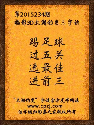 福彩3D第2015234期太湖字谜:踢足球,过五关,选最佳,进前三