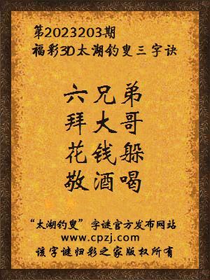 3d第2023203期太湖钓叟字谜:六兄弟,拜大哥,花钱躲,敬酒喝