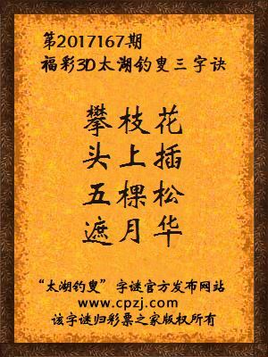 福彩第2017167期3d太湖字谜:攀枝花,头上插,五棵松,遮月华