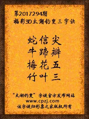 3d第2017294期太湖钓叟字谜:蛇信尖,牛蹄瓣,梅花五,竹叶三