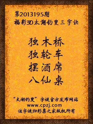 福彩3D第13195期太湖钓叟字谜:独木桥,独轮车,摆酒席,八仙桌