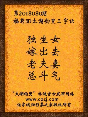 福彩第2018080期3d太湖字谜:独生女,嫁出去,老夫妻,总斗气