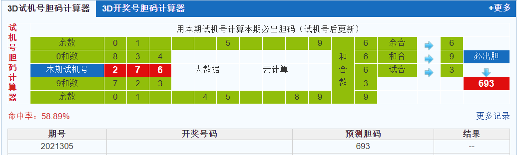 本期3d试机号胆码计算器给出结果:693