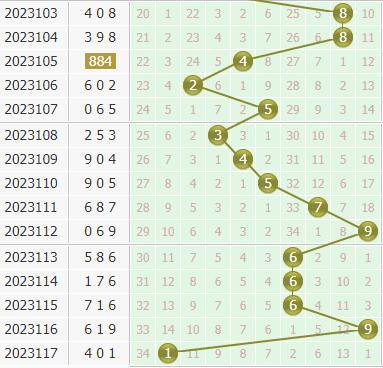 参考走势振幅表现,近5期个位走势上,振幅表现为3-0-0-3-8,可以看到近期频繁出现小振幅,上期大振幅出现后,预计再度转向小振幅。