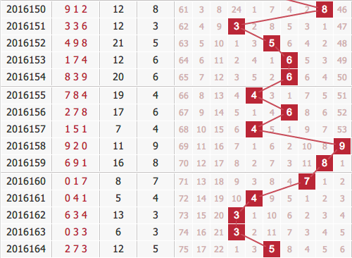 本期根据数字的质合属性将跨度进行分类,得到1、2、3、5、7五个质数跨度,以及0、4、6、8、9五个合数跨度。在看好胆码和跨度的情况下,包含的号码就有单选114注,组选20注,可以方便选号。