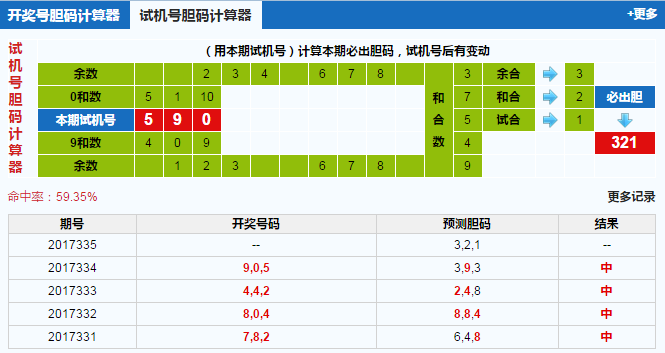 福彩3d第2017335期试机号:590,本期机球:1机1球,发布时间:2017-12-8 18:20,3d试机号胆码计算器:今晚必出胆码321,六码推荐:124679。