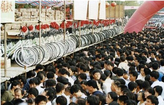 实物大奖除了汽车还有成排的自行车,飞鸽、永久那都是“头牌”。记得当时住同一个大院的哥们连续中奖,自己一人中了十几辆自行车,到最后都多到都卖不出去了。锣鼓喧天鞭炮齐鸣红旗招展人山人海,八九十年代人们的疯狂程度一点也不比现在差。