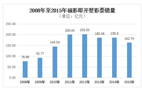 2015年福彩即开型彩票为162.74亿元,比2014年减少23.16亿元,同比减少12.45%。2008年至2011年,福彩即开票发展迅速,4年间增长了逾3倍。而从2012年开始至2015年,福彩即开票销量总体呈现下滑状态。