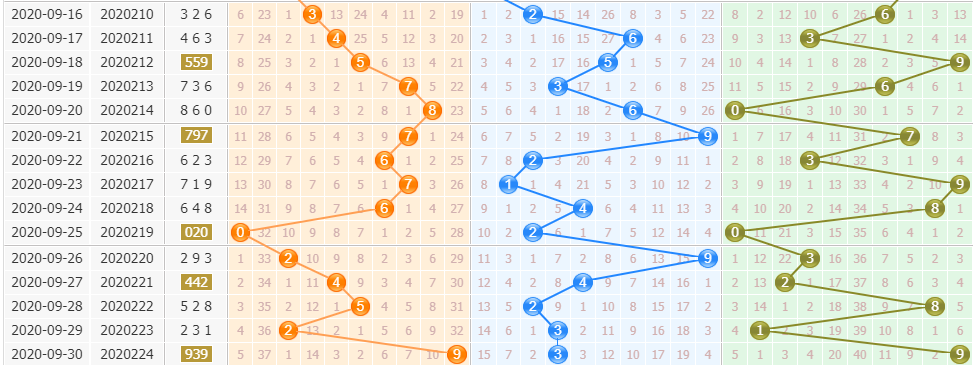 上期开出793,和值开出19,和值奇偶比为5:5,大小比为6:4,和值012路比为6:3:1,本期注意1路和值出现,参考和值16 19 20 21。
