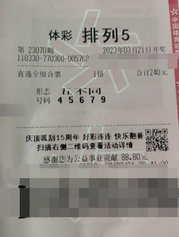 3月21日晚,体彩“排列5”第23070期开奖,开奖号码为:“5、6、7、9、4”。位于缙云县的体彩网点中