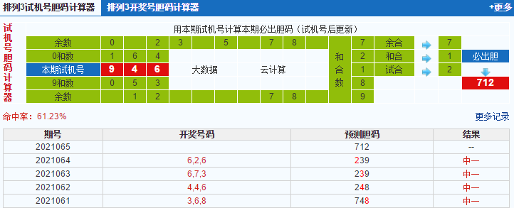 排列三第2021224期试机号:594,试机号胆码计算器:本期必出胆码为239,重合了一个9号球。4号球已经在试机号中连续出现六期,这个期数已经非常长了,近期有较高的命中概率,建议着重关注。